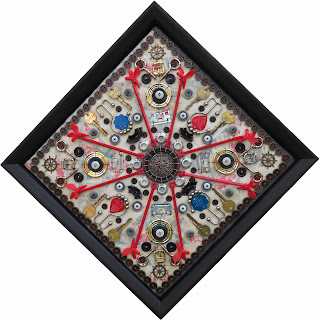 Above: Mandala XXXV. 2021. Custom framed 13" x 13". Found objects hand stitched to a block of a vintage quilt. Found objects include: a bracelet, clock gears, external tooth washers, red syringe caps, keys, drapery hooks, buttons, laminated Tampa Nugget cigar bands, zipper pulls, and a pair of Central or South American cloth figures.In a private collection.